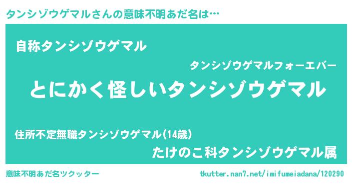 | 女子向けラノベタイトル風あだ名 | 『タンシゾウゲマルの卵を拾いまして』 |