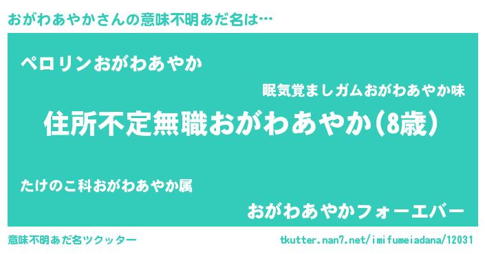 | 女子向けラノベタイトル風あだ名 | 『おがわあやかが死なない童話 林檎のおがわあやかの診療簿』 |