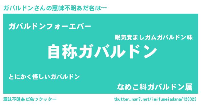 | 男性向けラノベタイトル風あだ名 | 『Re:ガバルドンから始める異世界生活』 |
