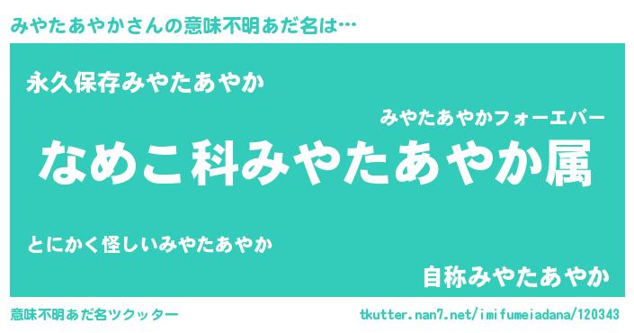 | ヘコむあだ名 | 『みやたあやか(笑)』『酢こんぶ』 |