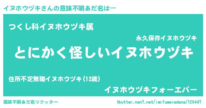 | 男性向けラノベタイトル風あだ名 | 『イヌホウヅキの嫁は女の子じゃないと思った?』 |