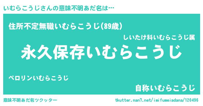 | 男性向けラノベタイトル風あだ名 | 『いむらこうじという概念が存在しない退屈な世界 』 |