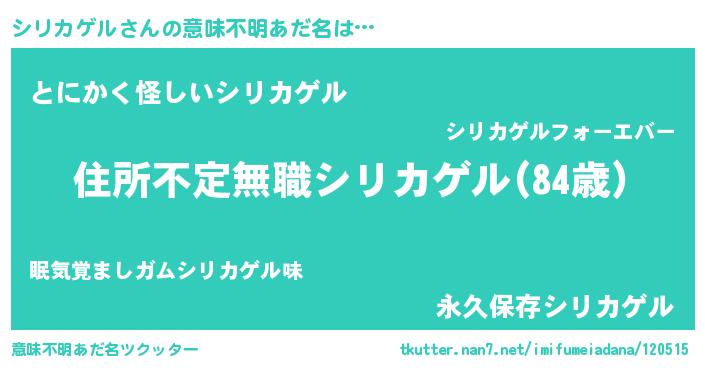 | 女子向けラノベタイトル風あだ名 | 『乙女ゲームの破滅フラグしかない悪役シリカゲルに転生してしまった…』 |