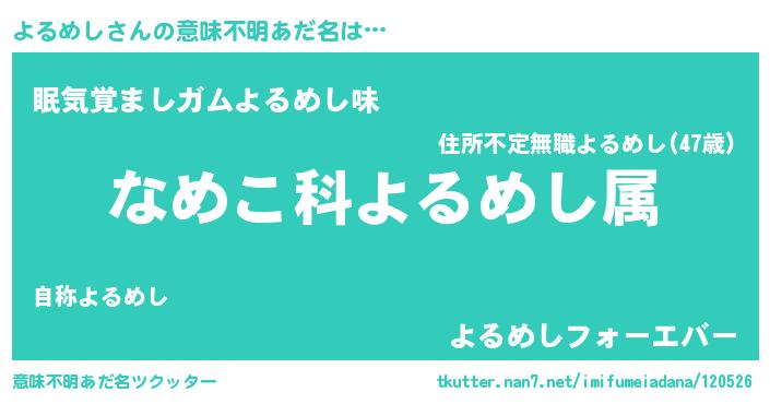 | 男性向けラノベタイトル風あだ名 | 『転生したらよるめしだった件』 |
