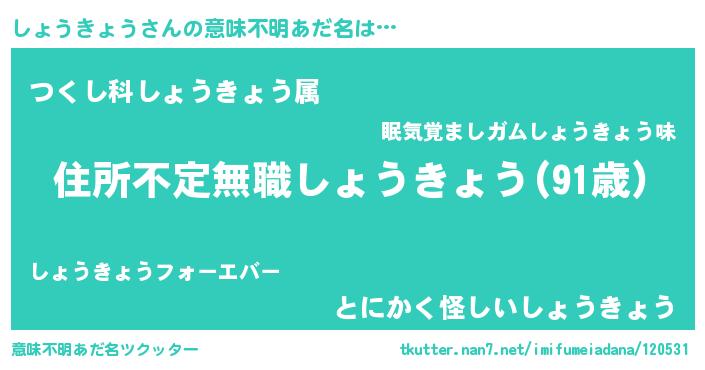 | 胡散臭い通販商品みたいなあだ名 | 『あなたにだけ特別に提供する世界で10本だけ現存している希少なブランデー…その名も「しょうきょう」』 |