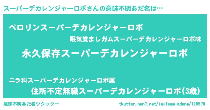| 胡散臭い通販商品みたいなあだ名 | 『前代未聞の健康食品…その名も「スーパーデカレンジャーロボ」』 |