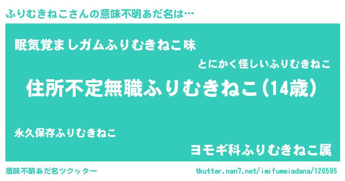 | 男性向けラノベタイトル風あだ名 | 『ふりむきねこに滅ぼされるだけの簡単なお仕事です』 |