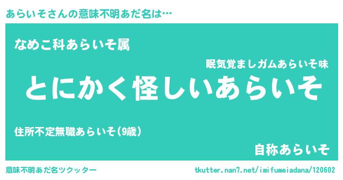 | ヒーロー風カッコイイあだ名 | 『炎刃騎士アラ』『サイバー戦士アライソ』 |