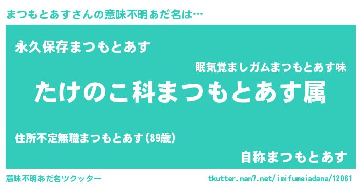 | 胡散臭い通販商品みたいなあだ名 | 『来世でも幸せになれる健康食品…その名も「まつもとあす」』 |