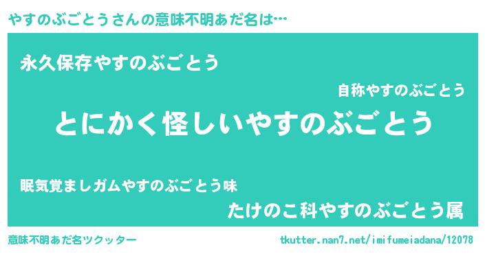 | 男性向けラノベタイトル風あだ名 | 『うちのやすのぶごとうが世界を掌握している!』 |