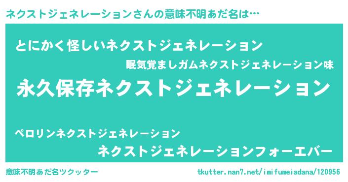 | 男性向けラノベタイトル風あだ名 | 『ネクストジェネレーションという概念が存在しない退屈な世界 』 |