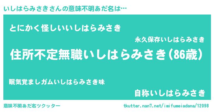 | 男性向けラノベタイトル風あだ名 | 『この素晴らしい世界にいしはらみさきを!』 |