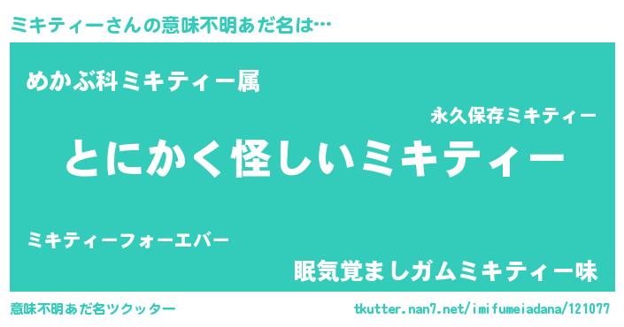 | 男性向けラノベタイトル風あだ名 | 『ミキティーの嫁は女の子じゃないと思った?』 |