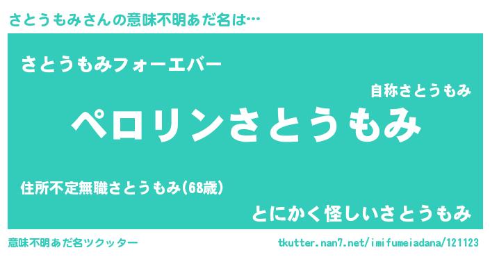 | 男性向けラノベタイトル風あだ名 | 『サトウモミアートオンライン』 |