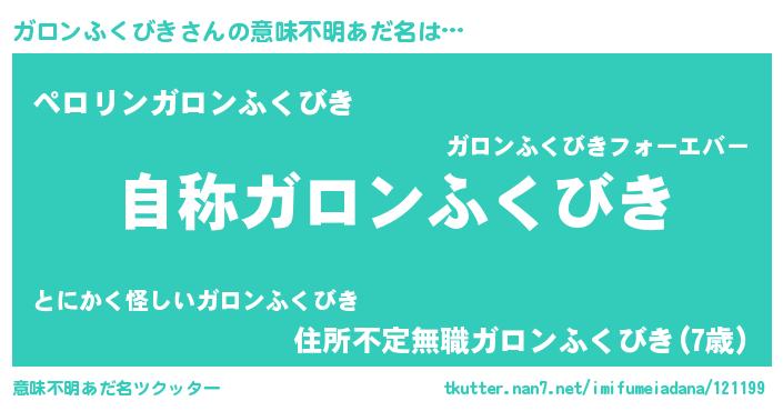 | 男性向けラノベタイトル風あだ名 | 『Re:ガロンふくびきから始める異世界生活』 |
