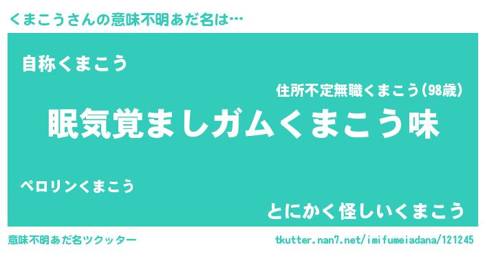 | 男性向けラノベタイトル風あだ名 | 『おまえをオタクにしてやるから、俺をくまこうにしてくれ! 』 |
