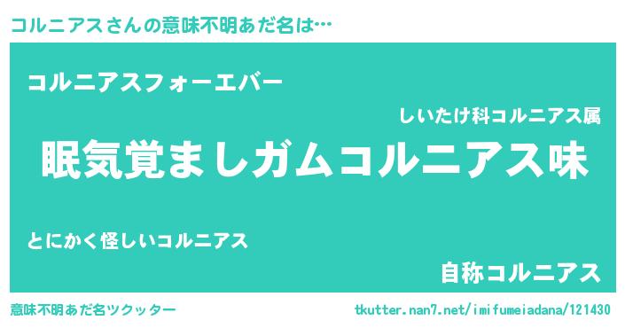 | 男性向けラノベタイトル風あだ名 | 『おまえをオタクにしてやるから、俺をコルニアスにしてくれ! 』 |