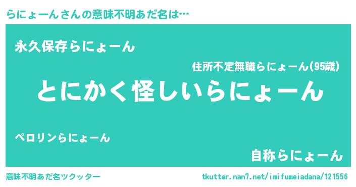 | 男性向けラノベタイトル風あだ名 | 『らにょーんの嫁は女の子じゃないと思った?』 |