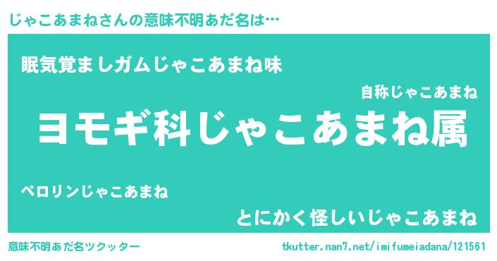 | 男性向けラノベタイトル風あだ名 | 『じゃこあまね~年齢イコール彼女いない歴の魔法使い~』 |