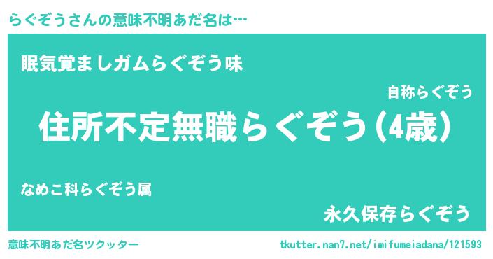 | 男性向けラノベタイトル風あだ名 | 『この素晴らしい世界にらぐぞうを!』 |