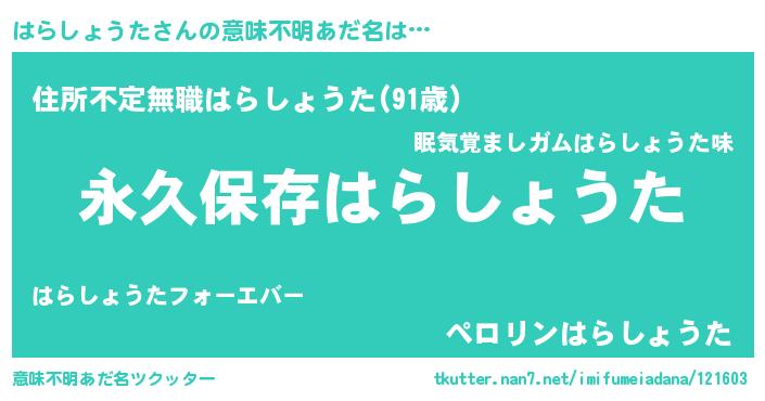 | 胡散臭い通販商品みたいなあだ名 | 『絶対に幸福をもたらす水素水…その名も「はらしょうた」』 |