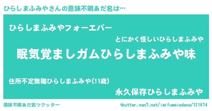 | 男性向けラノベタイトル風あだ名 | 『ノーゲーム・ノーヒラシマフミヤ』 |
