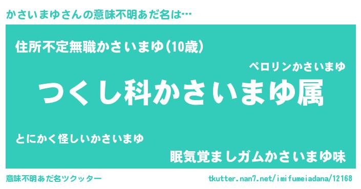 | 男性向けラノベタイトル風あだ名 | 『かさいまゆ~年齢イコール彼女いない歴の魔法使い~』 |