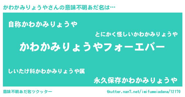 | 男性向けラノベタイトル風あだ名 | 『やはりかわかみりょうやの青春ラブコメはまちがっている 』 |