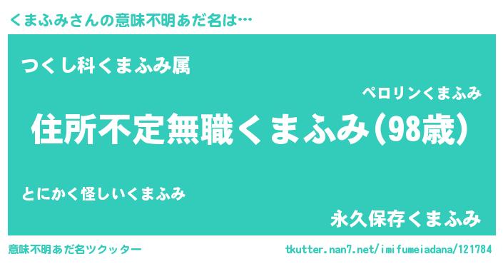 | 女子向けラノベタイトル風あだ名 | 『乙女ゲームの破滅フラグしかない悪役くまふみに転生してしまった…』 |