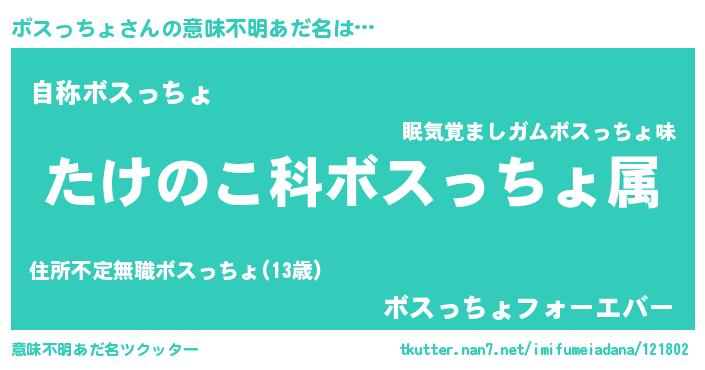 | 男性向けラノベタイトル風あだ名 | 『転生したらボスっちょだった件』 |