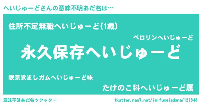 | 男性向けラノベタイトル風あだ名 | 『へいじゅーどという概念が存在しない退屈な世界 』 |