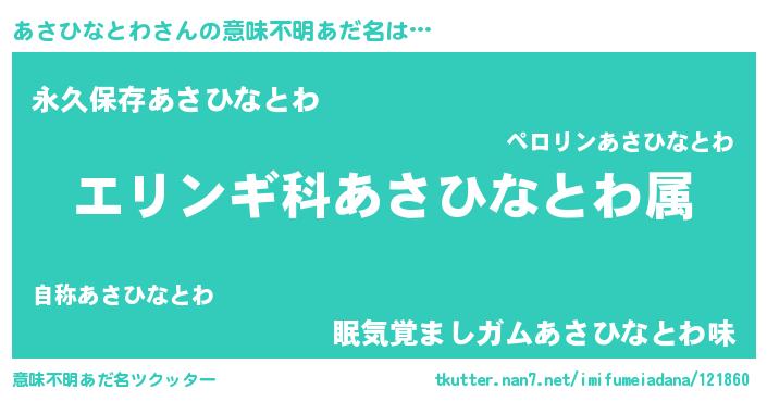 | 欧米人風あだ名 | 『アンジェラ・あさひなとわ』 |