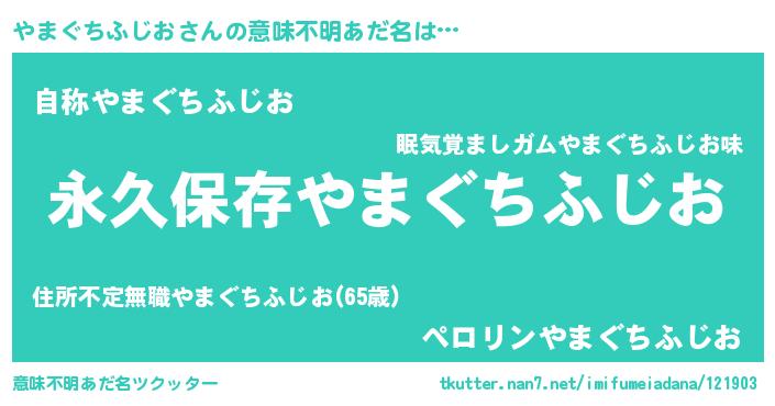 | 胡散臭い通販商品みたいなあだ名 | 『来世でも幸せになれる健康食品…その名も「やまぐちふじお」』 |