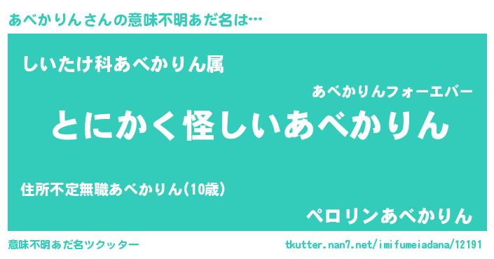| 男性向けラノベタイトル風あだ名 | 『あべかりんの嫁は女の子じゃないと思った?』 |