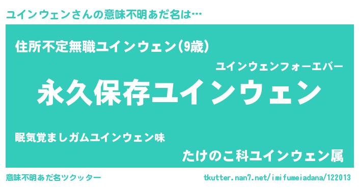 | 男性向けラノベタイトル風あだ名 | 『ユインウェンという概念が存在しない退屈な世界 』 |