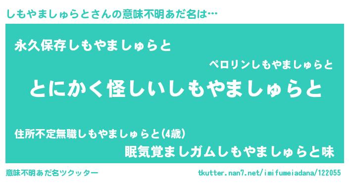 | 男性向けラノベタイトル風あだ名 | 『ダンジョンにしもやましゅらとを求めるのは間違っているだろうか』 |