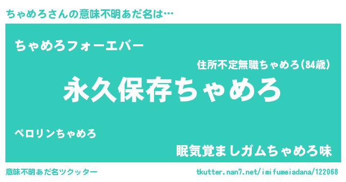 | 男性向けラノベタイトル風あだ名 | 『ちゃめろという概念が存在しない退屈な世界 』 |