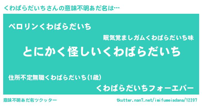 | 男性向けラノベタイトル風あだ名 | 『くわばらだいちの嫁は女の子じゃないと思った?』 |