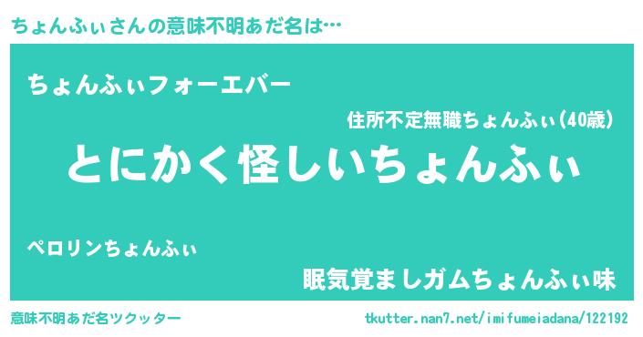 | 女子向けラノベタイトル風あだ名 | 『ちょんふぃの卵を拾いまして』 |