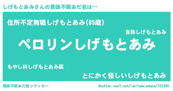 | 男性向けラノベタイトル風あだ名 | 『シゲモトアミアートオンライン』 |