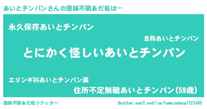 | 男性向けラノベタイトル風あだ名 | 『あいとチンパンの嫁は女の子じゃないと思った?』 |