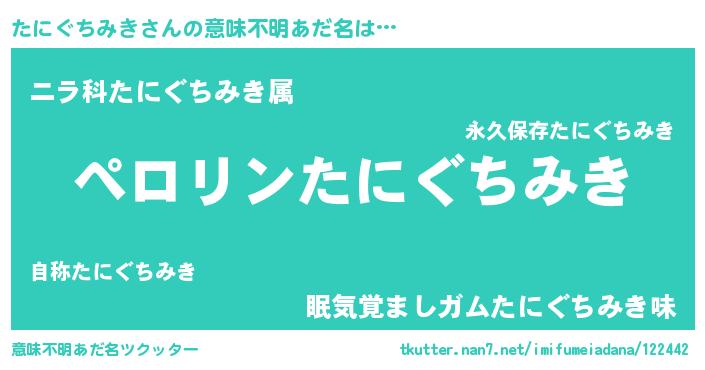 | 男性向けラノベタイトル風あだ名 | 『うちのたにぐちみきが世界を掌握している!』 |