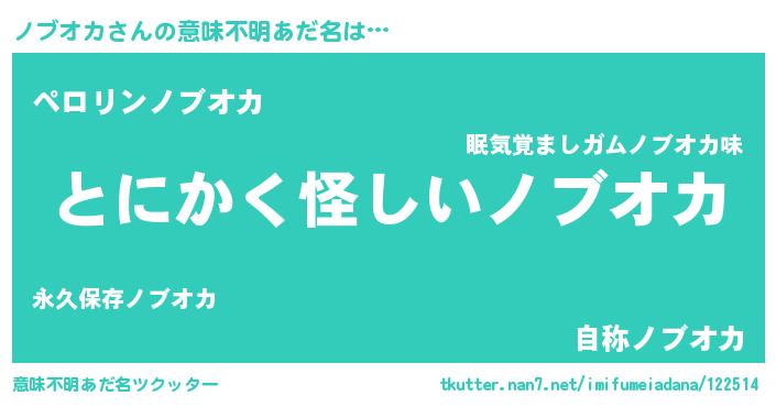 | 男性向けラノベタイトル風あだ名 | 『ダンジョンにノブオカを求めるのは間違っているだろうか』 |