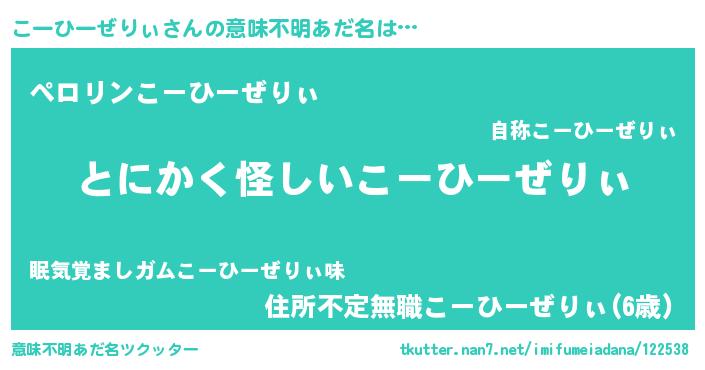 | 男性向けラノベタイトル風あだ名 | 『こーひーぜりぃの嫁は女の子じゃないと思った?』 |