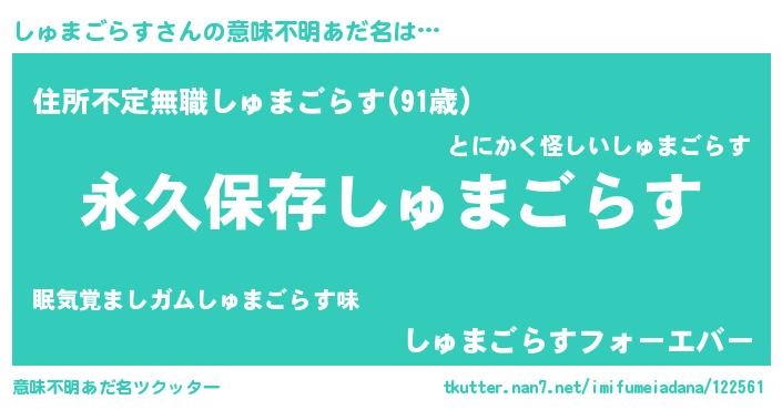 | 男性向けラノベタイトル風あだ名 | 『しゅまごらすに滅ぼされるだけの簡単なお仕事です』 |