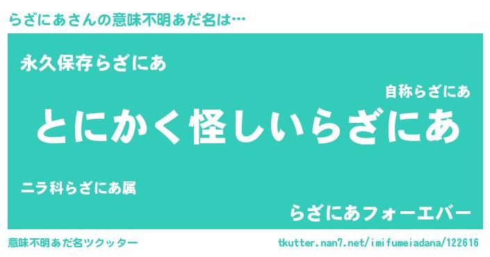 | 男性向けラノベタイトル風あだ名 | 『らざにあに滅ぼされるだけの簡単なお仕事です』 |