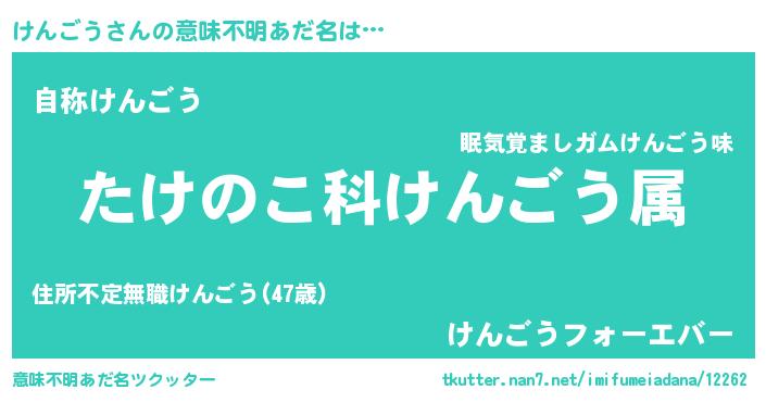 | 男性向けラノベタイトル風あだ名 | 『転生したらけんごうだった件』 |