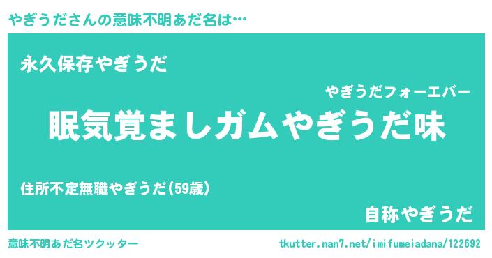 | 男性向けラノベタイトル風あだ名 | 『おまえをオタクにしてやるから、俺をやぎうだにしてくれ! 』 |