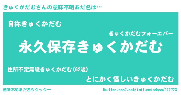 | 男性向けラノベタイトル風あだ名 | 『きゅくかだむという概念が存在しない退屈な世界 』 |