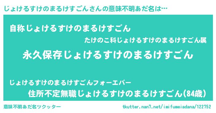 | 男性向けラノベタイトル風あだ名 | 『うちのじょけるすけのまるけすごんが世界を掌握している!』 |